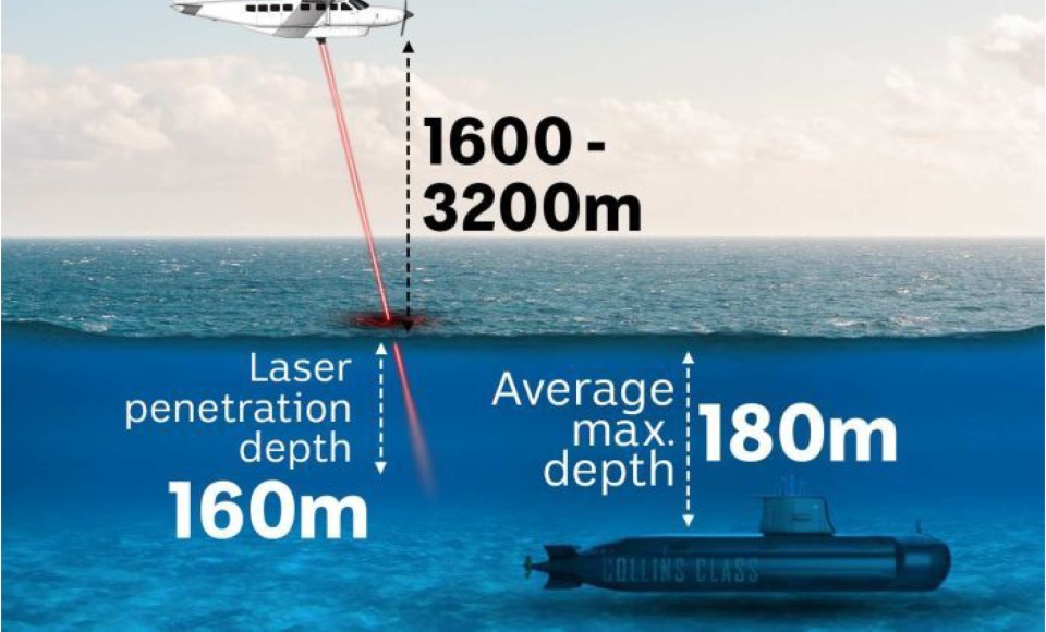 β) Ανίχνευση με Λέιζερ. Λέιζερ με μήκη κύματος στο οπτικό φάσμα μεταξύ Μπλε και Πράσινου (400 με 550 νμ) εισχωρούν βαθύτερα στο θαλασσινό νερό από όλα τα αλλά μήκη κύματος. Το λέιζερ με μπλε μήκος κύματος (~490 νμ) εισχωρεί βαθύτερα σε βαθειά ανοιχτά ωκεάνια νερά, ενώ το πράσινο (~550 νμ) είναι προτιμότερο για θαλάσσιες περιοχές κοντά σε ακτές που το νερό έχει διαφορετικές οπτικές ιδιότητες. Πάλι οι κινέζοι είναι πιο δραστήριοι και εδώ, στη χρήση λέιζερ για ανίχνευση και στοχοποίηση υποβρυχίων. Βέβαια, το βάθος του υποβρυχίου είναι καθοριστικό στο αν το λέιζερ είναι αποτελεσματικό και πρέπει να ληφθεί υπόψιν και η διάθλαση στην είσοδο και έξοδο της ακτίνας στο νερό. Πόσο πρακτικά αποτελεσματική είναι μια τέτοια ανίχνευση; Αρχικά το υποβρύχιο πρέπει να βρίσκεται σε βάθος, όπου το λέιζερ να είναι ικανό να το “φωτίσει”. Το κυριότερο όμως είναι πως το αεροσκάφος που χρησιμοποιεί ένα τέτοιο λέιζερ πρέπει να ξέρει που περίπου είναι το υποβρύχιο. Στην Εικόνα 11 απεικονίζεται μια ιδανική περίπτωση αεροσκάφους και υποβρυχίου, λίγο βαθύτερα από το μέγιστο αποτελεσματικό βάθος του λέιζερ. Ο αναγνώστης παρατηρεί ότι ο δημιουργός της εικόνας δεν έχει λάβει υπόψιν την διάθλαση του λέιζερ.